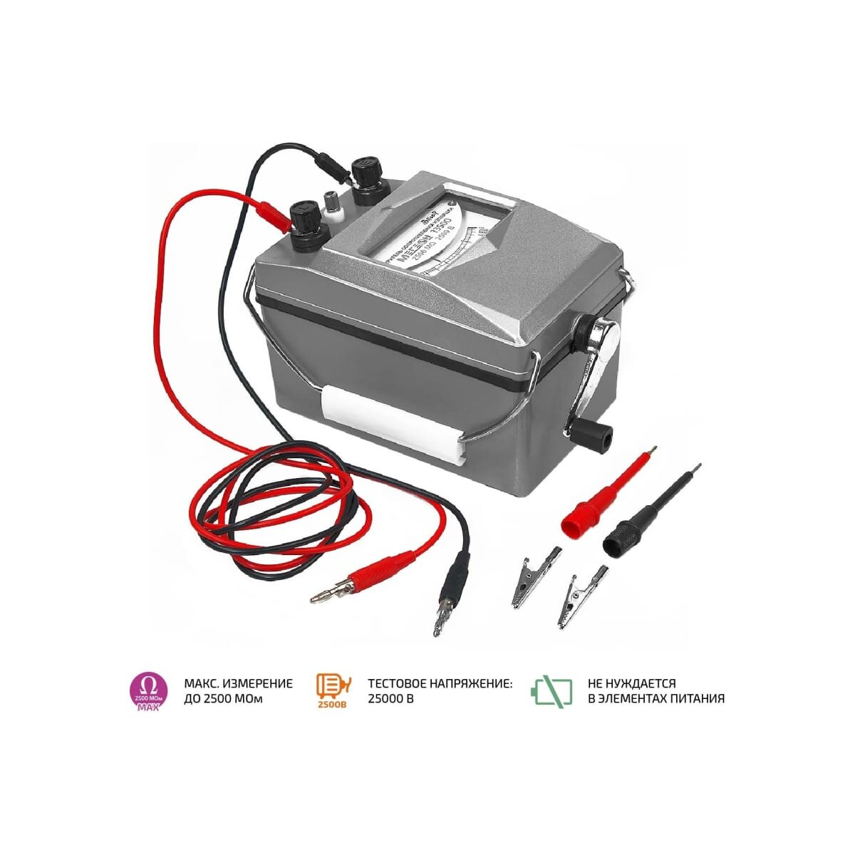 Мегаомметр позволяет измерять сопротивление изоляции в диапазоне 0-2500 МОм. С его помощью можно определить сопротивление различного электрооборудования, кабелей, средств телекоммуникации и т.д. Для достижения наиболее точных показаний следует учитывать параметры влажности и температуры воздуха. Испытательное напряжение составляет 2500 В.