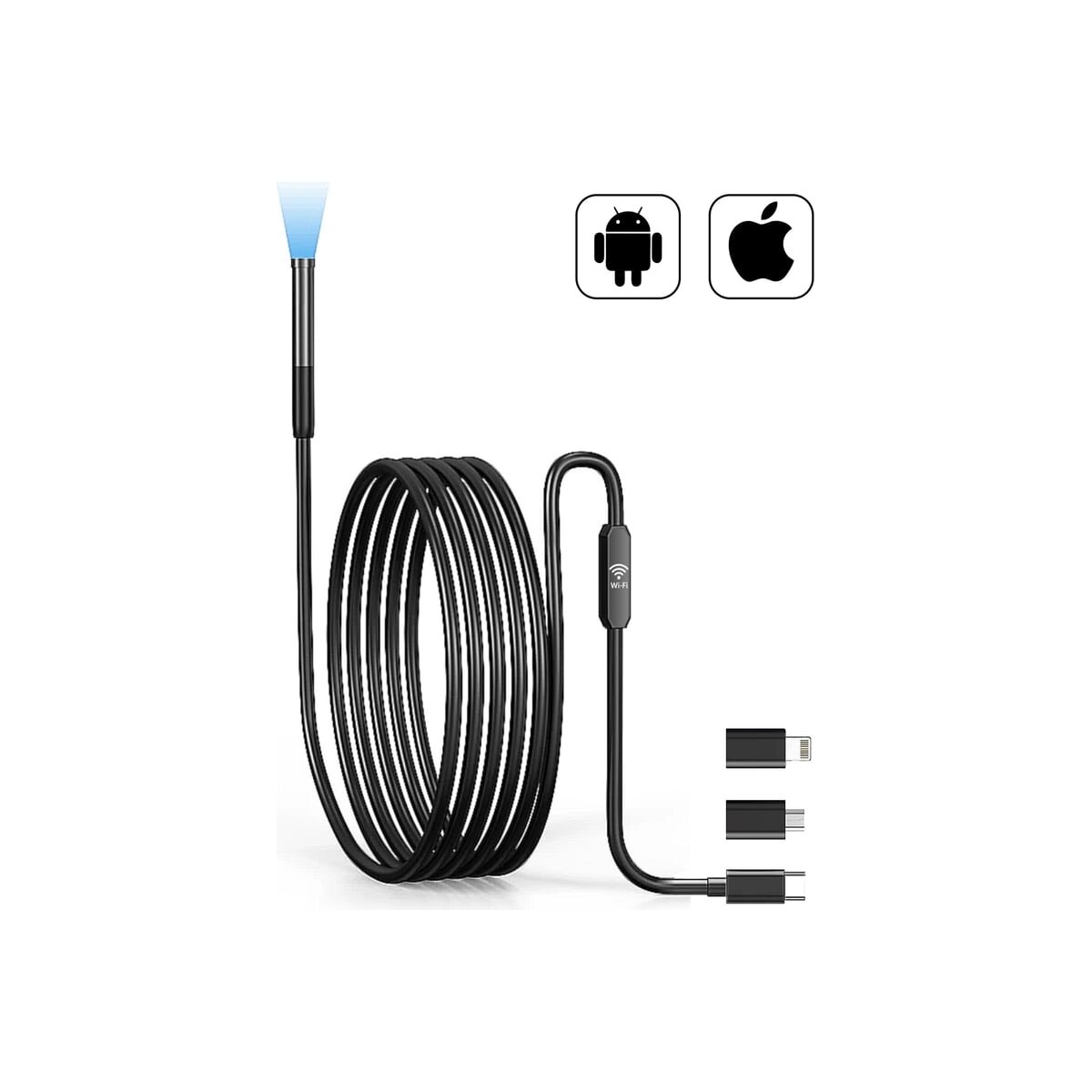 Портативный USB-видеоэндоскоп iCartool IC-V801 имеет камеру 2 Мп и полужесткий зонд диаметром 7,9 мм и длиной 1м. Прибор оснащен разъемом USB Type-C и переходниками Lightning и Micro-USB, благодаря чему совместим практически со всеми смартфонами/планшетами на базе iOS/Android. Питание осуществляется за счет устройства, к которому подключен эндоскоп, а передача изображения происходит через модуль Wi-Fi, интегрированный в зонд.