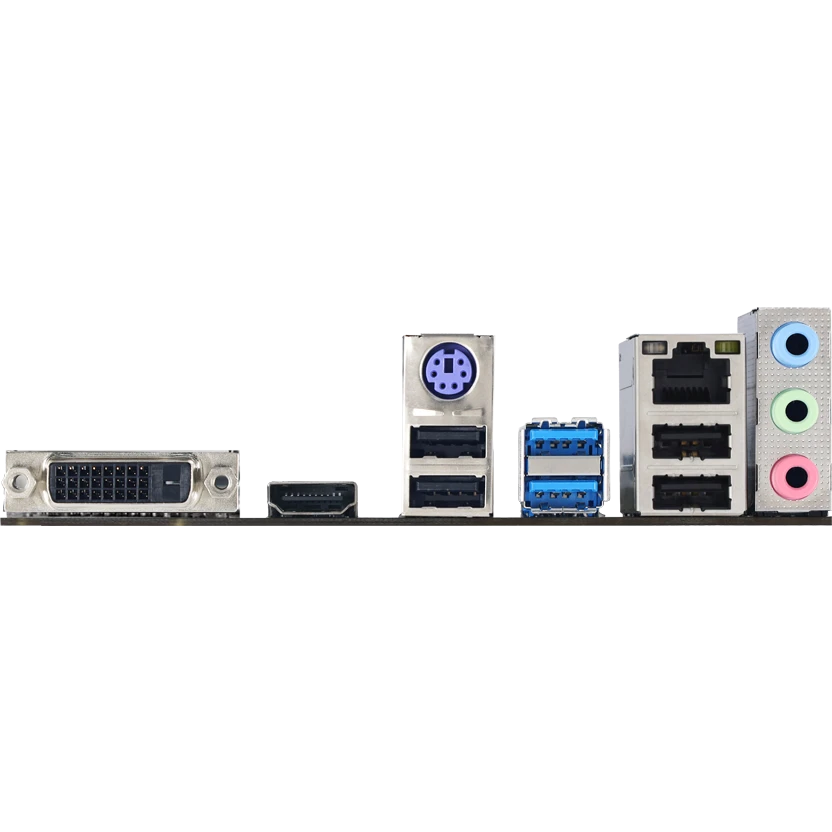 PS/2, 4 x USB 2.0, 2 x USB 3.2 Gen1, DVI, HDMI, RJ-45
