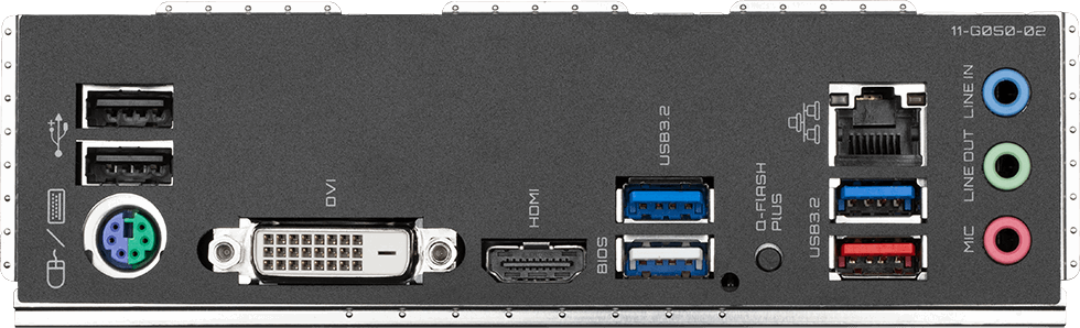Разъёмы на задней панели : PS/2, 2 x USB 2.0, 3 x USB 3.2 Gen1, USB 3.2 Gen2, DVI, HDMI, RJ-45