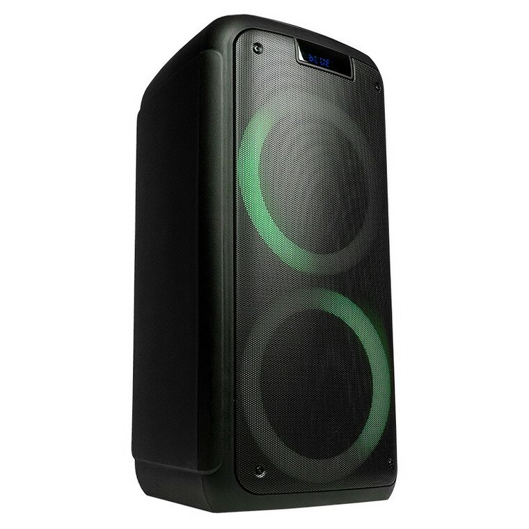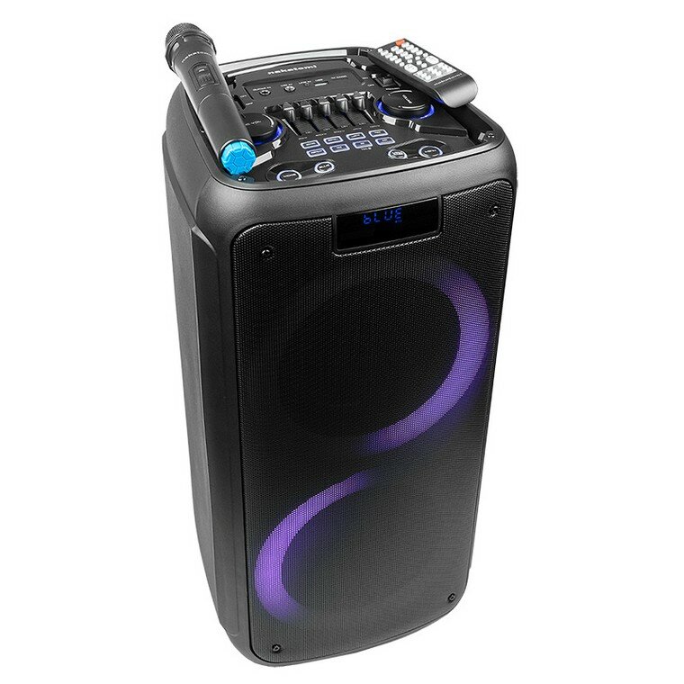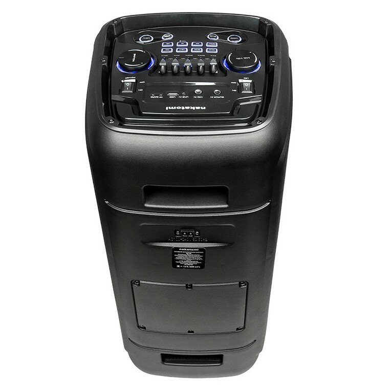 Управлениена верхней панели: переключатель питания, следующая запись/радиостанция, предыдущая запись/радиостанция, воспроизведение/стоп, выбор режима (источника звука), меню, общая громкость - поворотный регулятор, громкость микрофона - поворотный регулятор, запись с микрофона, механический эквалайзер, режим динамической подсветки, эхо микрофона больше/меньше, повтор воспроизведения, мега бас