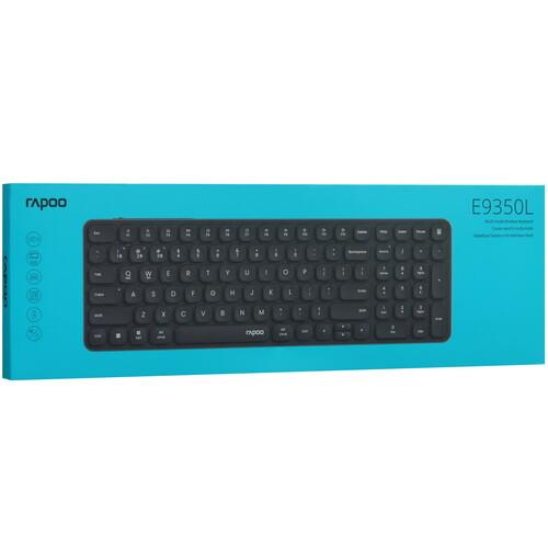 Клавиатура беспроводная RAPOO E9350L выполнен в черном корпусе из алюминия и пластика. Она подключается к устройству 2 способами: через Bluetooth и радиоканал с частотой 2.4 Гц. Во втором случае используется USB-ресивер. При подключении связь с ПК будет стабильной на расстоянии 10 м. Устройство работает от аккумулятора и заражается при помощи кабеля USB.