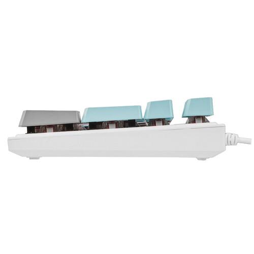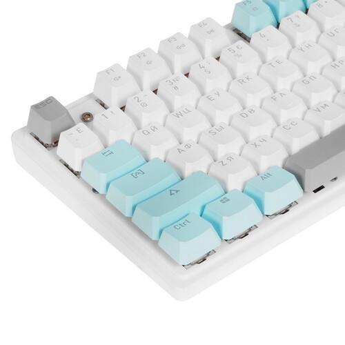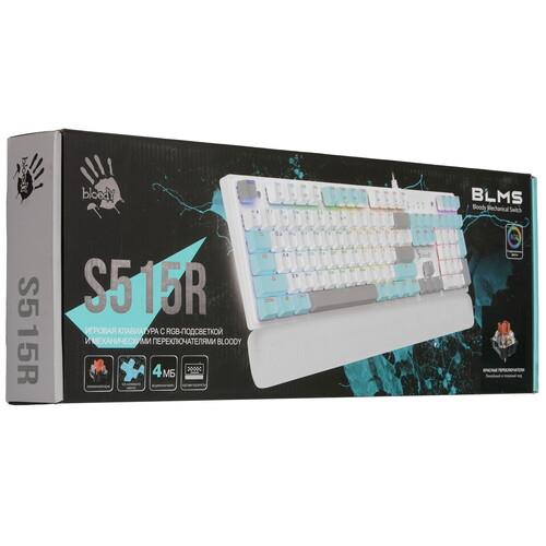 Полноразмерная проводная клавиатура A4Tech Bloody S515R имеет 104 клавиши с отдельным блоком цифр и линейкой Fn с различными функциями. Все клавиши разделены на 3 цвета по функциям: буквы и цифры белые, стрелки, пробел и некоторые другие – серые, а колонка Fn – голубая. Для удобства работы в темноте или при слабом искусственном освещении можно включить трехцветную RBG-подсветку.