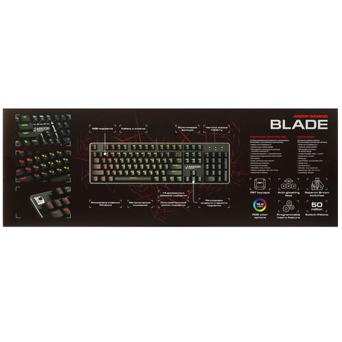 Клавиатура проводная ARDOR GAMING Blade заключена в металлический корпус черного цвета, который отличается устойчивостью к преждевременному появлению повреждений. Основа модели – тактильные переключатели Gateron Brown. Они продемонстрируют способность к мгновенному отклику на касания. Выполненным из PBT кейкапам не свойственно образование потертостей и утрата яркости оттенка.