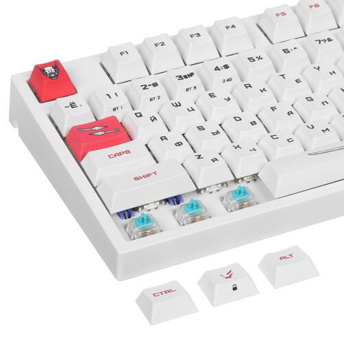 ARDOR GAMING Katana предусматривает 3 варианта подключения: на радиоканальной частоте 2.4 ГГц, по беспроводной технологии Bluetooth и через кабель USB. Система Hot Swap позволяет заменять переключатели. В автономном режиме клавиатура работает от встроенного аккумулятора. В комплекте поставляются сменные свитчи, кейкапы и тематические стикеры.