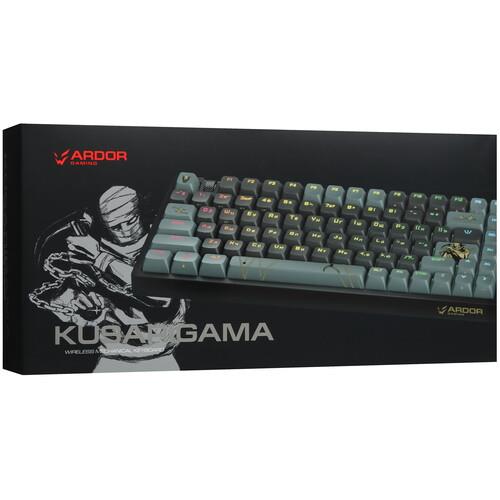 Клавиатура ARDOR GAMING Kusarigama использует при беспроводном подключении Bluetooth или радиоканал. В последнем случае соединение с компьютером производится с помощью миниатюрного USB-ресивера. Поддерживается функция одновременной работы с 2, 3 или 4 устройствами. Модель поддерживается операционной системой Windows. В автономном режиме клавиатура получает питание от аккумулятора с емкостью 4000 мА·ч.