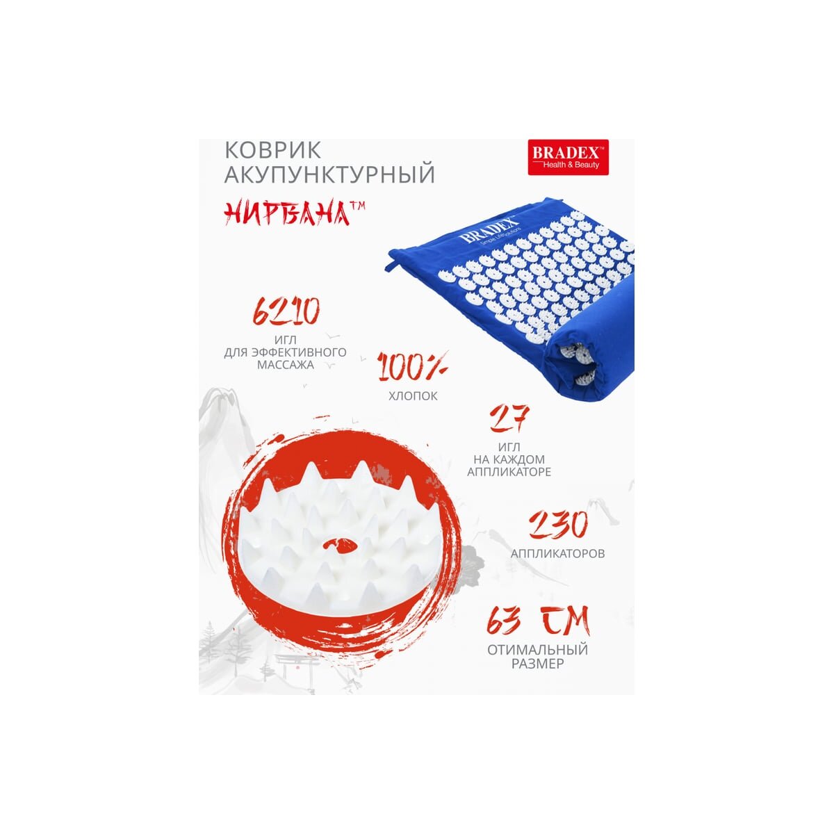 Материал чехла: 100% хлопок. Материал шипов: АБС-пластик. Наполнитель: полиуретановая пена. Круглые аппликаторы: 27 игл. Кол-во аппликаторов: 230 шт.