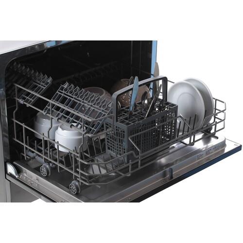 Несмотря на свои небольшие размеры, Electrolux ESF2400OK вмещает до 6 комплектов посуды. Этого вполне достаточно для небольшой семьи или для одного-двух человек. Отдельный лоток для столовых приборов и полочки для чашек обеспечивают оптимальное размещение посуды и качественную мойку.
