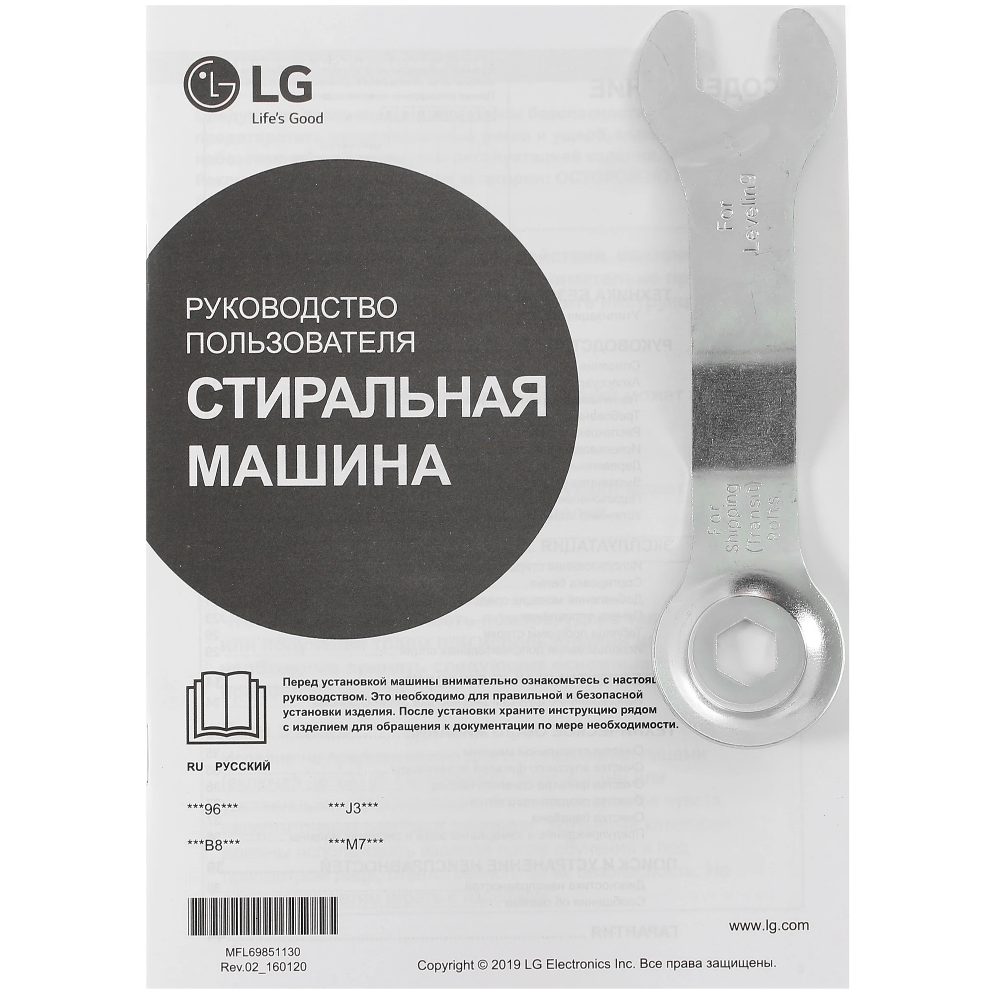 Гаечный ключ, документация, заглушки для транспортировочных болтов, кронштейн для крепления шланга и другие элементы.