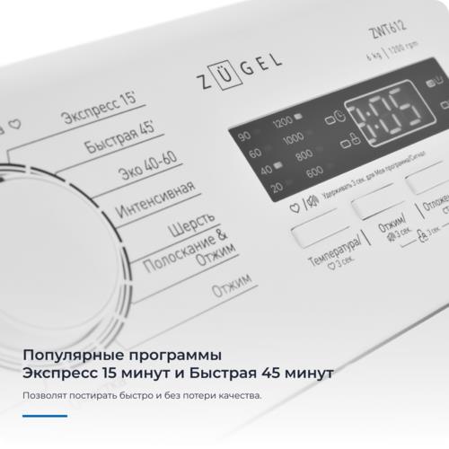 Стиральная машина ZUGEL ZWT612 отличается тихой работой (64 дБ). Выбрать нужную температуру (0 - 90 °C), скорость отжима или отсрочку запуска можно с помощью кнопок. Причем вся информация о текущем состоянии стиральной машины отобразится на дисплее. Режим очистки барабана предусматривает периодическое удаление засоров и известкового налета, что увеличит срок службы машинки.