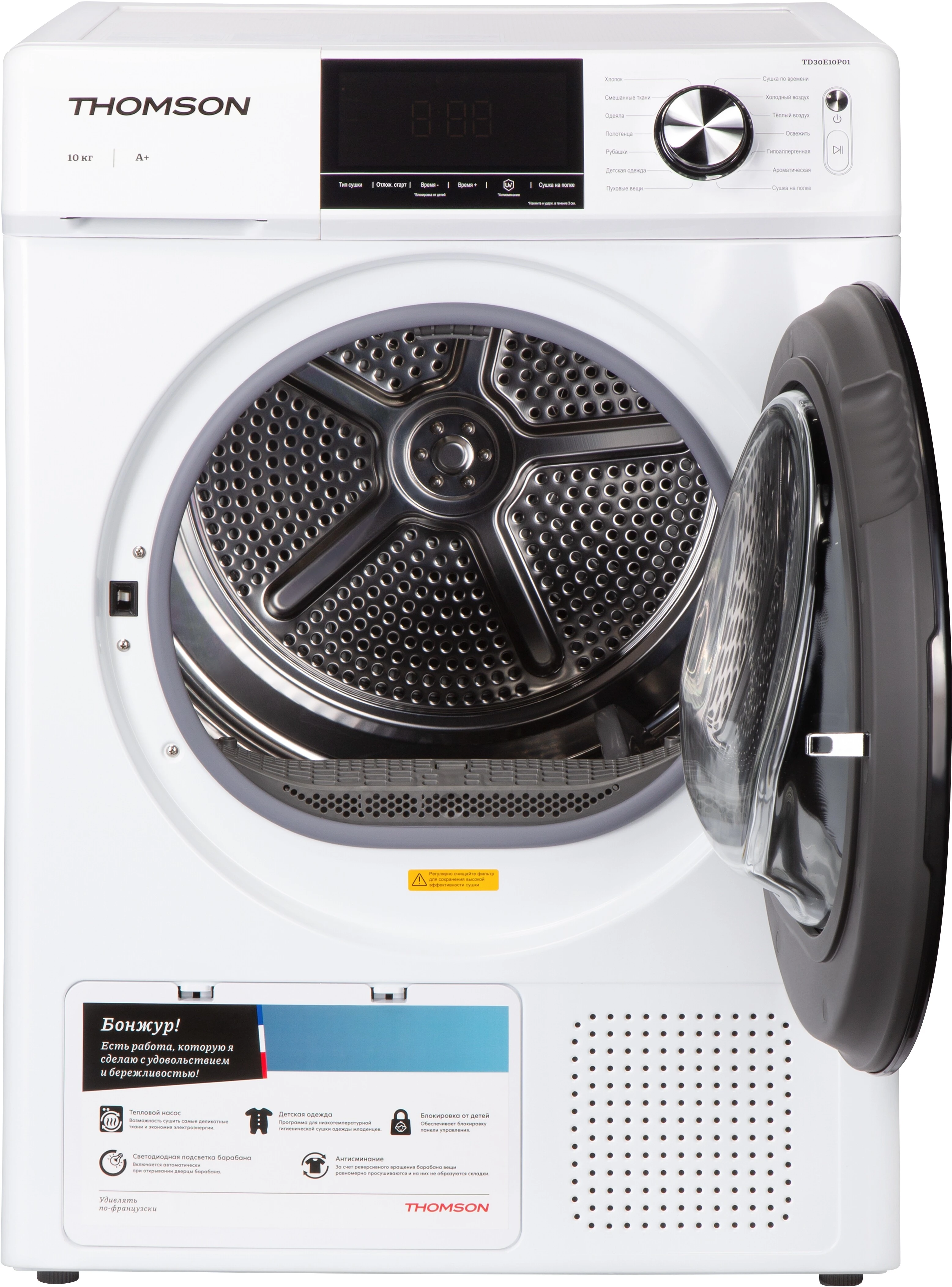 Модель рассчитана на сушку до 10 кг белья за один цикл, что делает её идеальным выбором для большой семьи или тех, кто предпочитает стирать и сушить белье большими партиями.