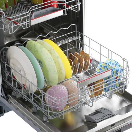 Встраиваемая посудомоечная машина Bosch SMV8YCX02E на 14 комплектов с 3 корзинами. Верхний разбрызгиватель для эффективной мойки при полной загрузке и минералы цеолиты для быстрой сушки и экономии энергии. Проецируемый на пол луч показывает текущий этап и время до конца цикла. Управляется голосом или через мобильное приложение, поддерживает 8 программ мойки и самоочистки, таймер отсрочки. Сенсор чистоты воды определяет степень загрязнения посуды и подбирает оптимальные параметры цикла.