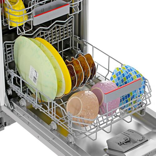 Встраиваемая посудомоечная машина Bosch SPV4XMX28E в узком серебристом корпусе вмещает 10 комплектов. Складные полки расширяют пространство камеры для удобной загрузки кастрюль и прочей большой посуды. Инверторный мотор отвечает за тихую работу в экономичном режиме. Встроенные датчики определяют жесткость и степень загрязнения воды. Вы можете использовать 6 автоматических режимов мойки и создавать собственную программу.