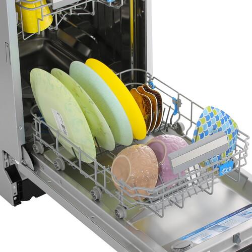 Midea MID45S450i оснащена 9 программами мойки, таймером отсрочки и бесшумным ночным режимом, функцией самоочистки. Индикаторы на дисплее подсказывают о необходимости добавления соли и ополаскивателя в соответствующие отсеки. Вы можете управлять посудомоечной машиной через Алису или приложение на смартфоне.