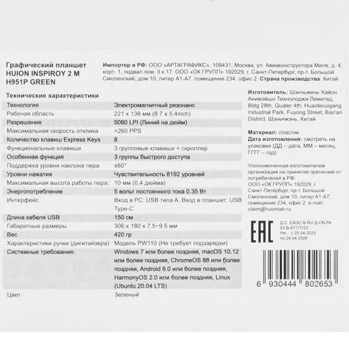 Ширина рабочей поверхности в графическом планшете HUION Inspiroy 2M составляет 221 мм. Время отклика модели – 260 точек в сек. Для удобного размещения пера предусмотрена подставка. Конфигурация устройства включает скроллер, который настраивается в меню драйверов.