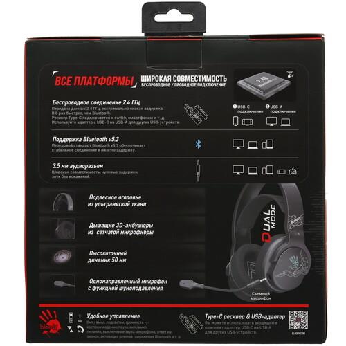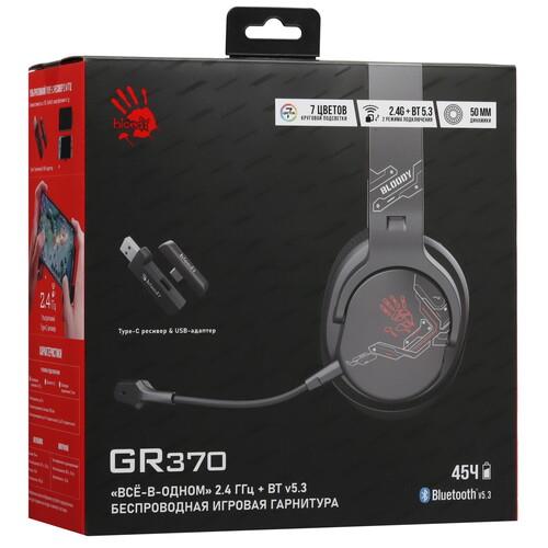 A4Tech Bloody GR370 - игровые наушники с тремя способами подключения: радиоканал, Bluetooth и проводным. Съемным гибким микрофоном, большими мягкими амбушюрами и семи цветной подсветкой. Время работы наушников от одного заряда емкого аккумулятора составляет 45 часов с выключенной подсветкой и 25 часов если подсветка включена.