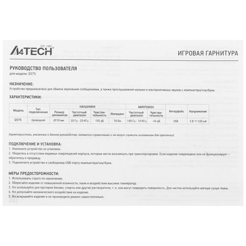 Гарнитура A4Tech Bloody G575 выполнена в прочном пластиковом корпусе, отличающимся стильным дизайном с подсветкой, и обладает бинауральной конструкцией охватывающего типа. Благодаря этому, а также мягким амбушюрам модель подарит комфортное использование даже в течение многих часов. Подключение гарнитуры осуществляется при помощи разъема USB, что обеспечивает совместимость с ПК, ноутбуками, игровыми приставками и другими устройствами.