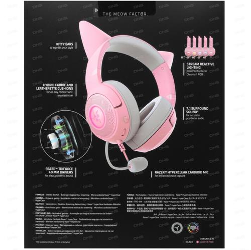 В наушниках установлен динамик с диапазоном частот от 20 до 20000 Гц. Он обеспечивает чистый и насыщенный звук. Микрофон с функцией шумоподавления позволяет общаться с друзьями и коллегами без помех. Подключение к устройствам осуществляется через стандартный разъем 3.5 мм, что делает Razer Kraken Kitty V2 универсальными и совместимыми с большинством компьютеров, ноутбуков и игровых консолей.