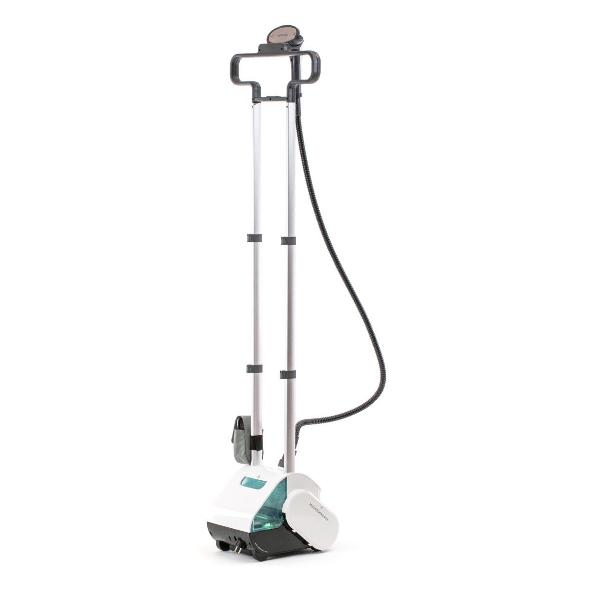 Накопитель для пара выполнен из алюминия, трубка — из термостойкого пластика. В комплекте есть две насадки: стандартная и щетка. Настройки регулируются с помощью механических переключателей, о готовности к использованию сообщает световой индикатор. Для удобного перемещения конструкция снабжена колесами, в корпусе есть отсек для сматывания сетевого шнура.