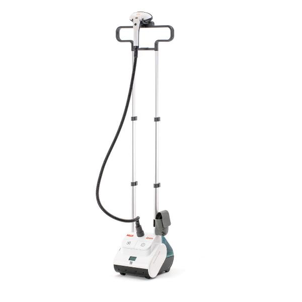 Ручной отпариватель Mie Deluxe выполнен в корпусе белого цвета, оборудован резервуаром для воды емкостью 2,5 л. Прибор работает в трех режимах, интенсивность подачи пара достигает 85 г/мин. Устройство потребляется 2600 Вт энергии, подключается к сети с помощью кабеля длиной 1,7 м. Всего через минуту можно начинать глажку.