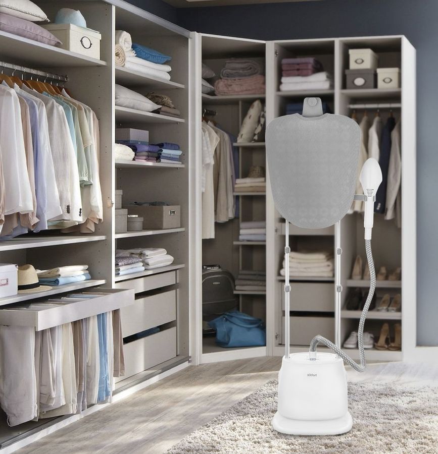 Описание: Позволяет быстро прогладить вещи: рубашки, блузы, брюки, пышные платья, шубы, дублёнки. Также он справится с изделиями из текстиля, в том числе с занавесками, портьерами, обивкой мягкой мебели, матрасами и другим. Гладильная доска с 3 фиксированными положениями 45°, 90° и 180°.