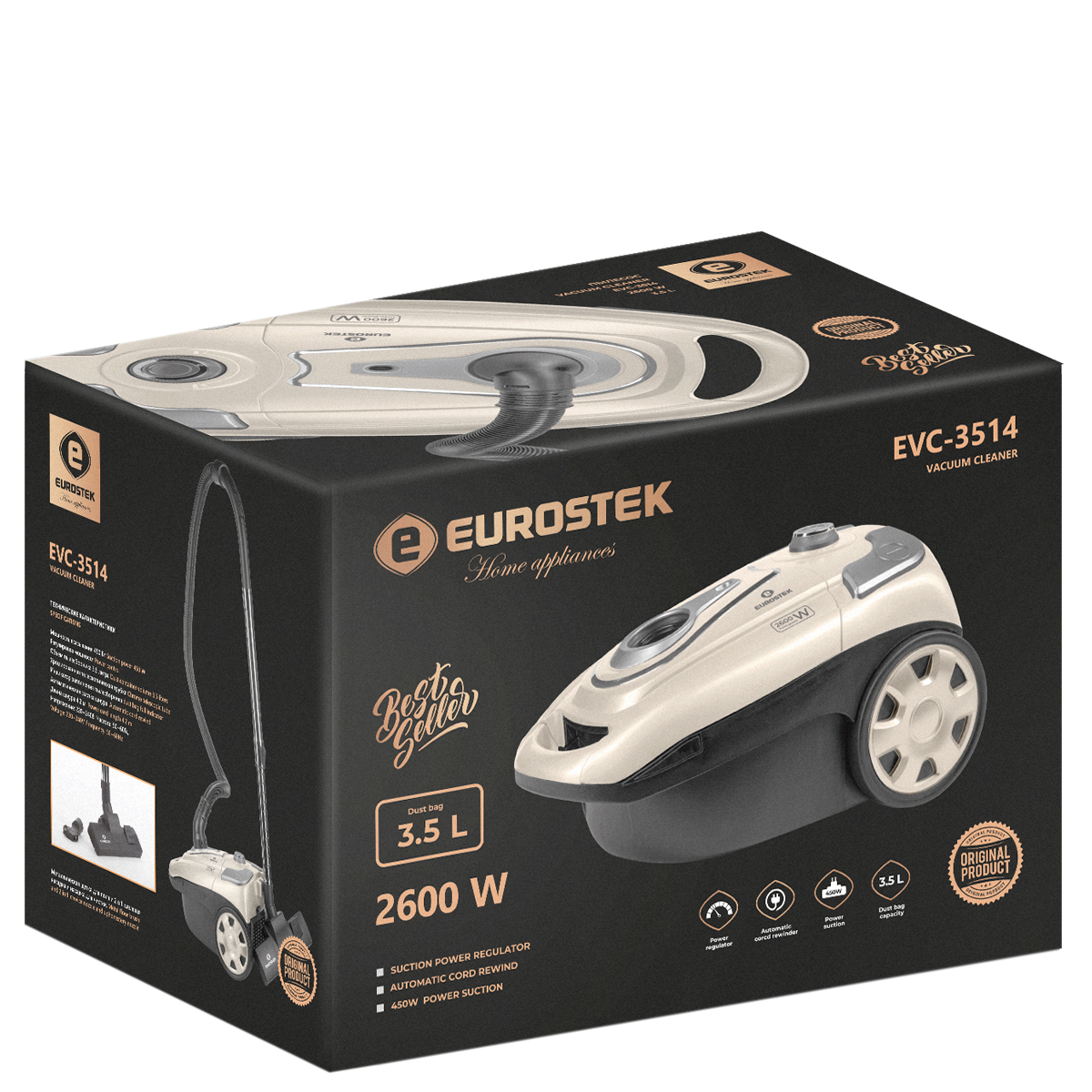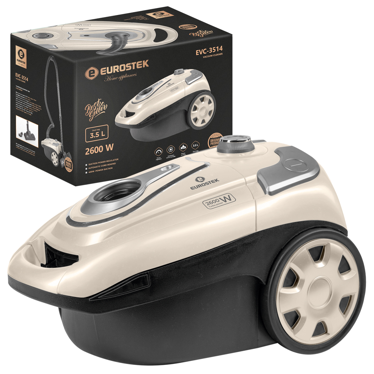 Пылесос электрический Eurostek EVC-3514 имеет мощность 2600 Вт, а мощность всасывания - 450 Вт. Тканевый пылесборник, объемом 3,5 л, индикатор заполнения пылесборника и функцию автоматической смотки шнура.