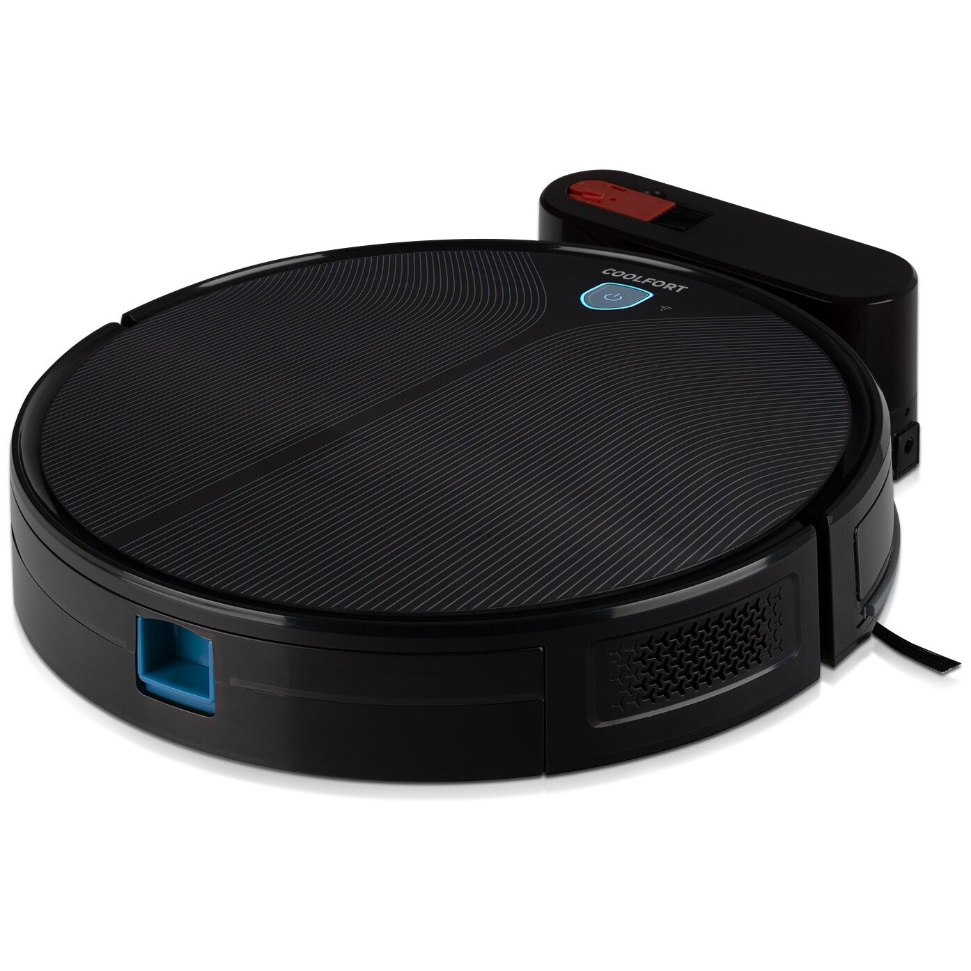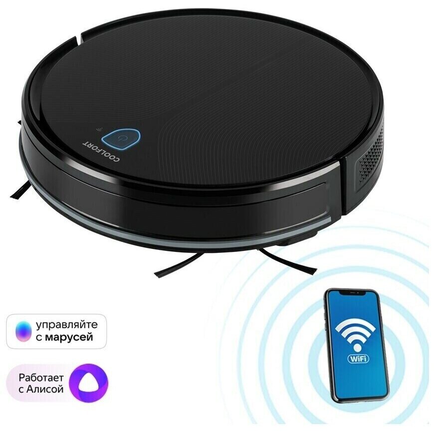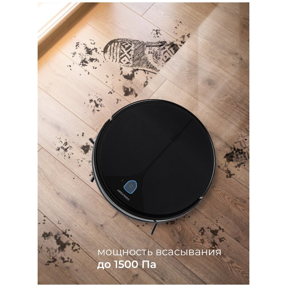мощность всасывания: 1500 Па; допустимая высота коврового покрытия 18 мм; комплектация: робот-пылесос, боковая щётка (2 шт.), пульт дистанционного управления, тряпочка из микрофибры, щёточка для чистки