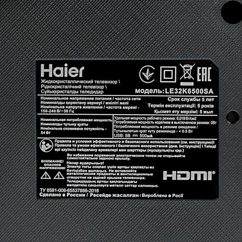 Телевизор LED HAIER LE32K6500SA имеет стандартное соотношение сторон (16:9) и поддержку стандарта HD 720p. Благодаря хорошим параметрам матрицы, включающим в себя высокую яркость (220 Кд/м²) и оптимальную контрастность (3000), обеспечивается хорошее качество изображения. Частота обновления экрана достигает 60 Гц, благодаря чему даже при просмотре динамичных сцен вы не заметите подтормаживаний в трансляции видеоряда. Угол обзора - 160° / 150°.