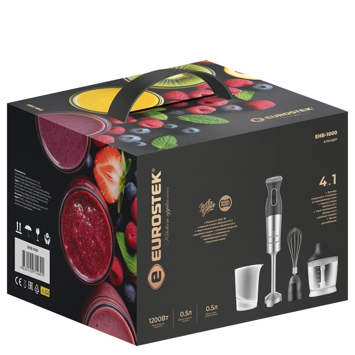 Блендер погружной EHB-1000. Мощность 1200 Вт, низкий уровень шума, 2 скорости, стальной нож, мерный стакан - 500мл, стальной венчик, измельчитель - 500мл