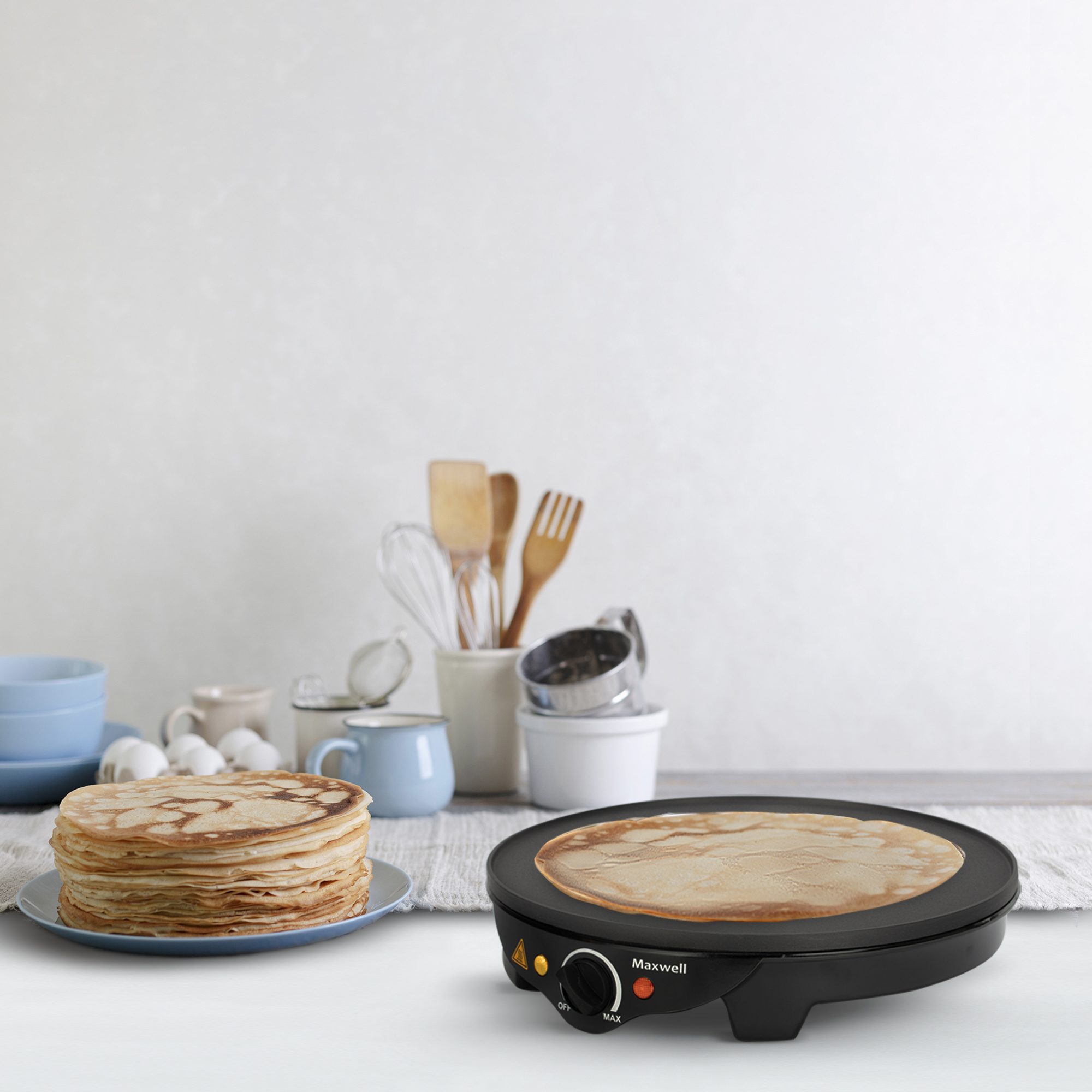 Испечь красивые румяные блинчики диаметром 30 см для всей семьи или большой компании гостей позволит блинница Maxwell MW-1973 с номинальной потребляемой мощностью 1100-1300 Вт (электропитание: 220-240 В~ 50-60 Гц). Выбирать оптимальную температуру нагрева прибора можно самостоятельно — поворотом специального регулятора. Благодаря высококачественному антипригарному покрытию поверхности устройства, блинчики получаются невероятно аппетитными. Да и мыть прибор после использования очень легко. В комплект с блинницей входят две деревянные лопаточки: для распределения теста по поверхности и для переворачивания изделий.