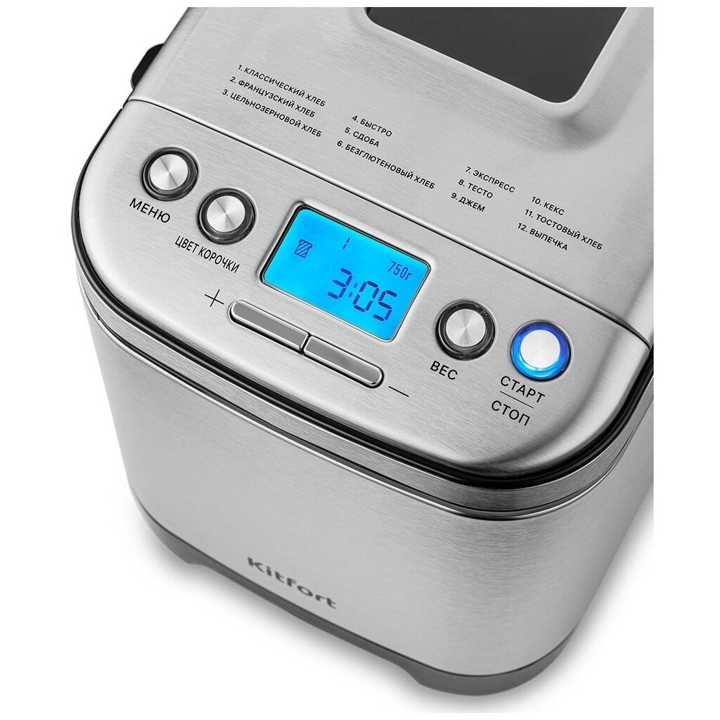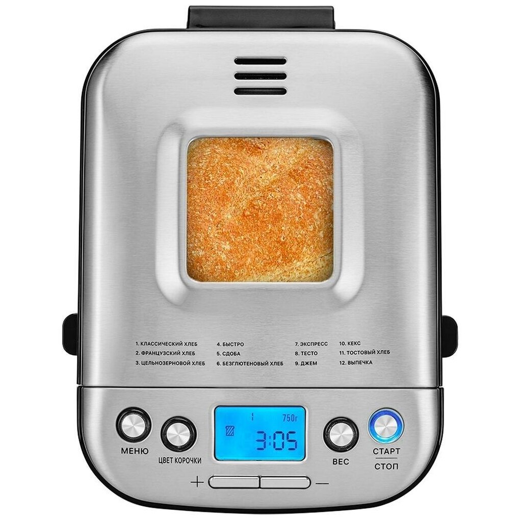 Программы: варенье, кекс, Тесто, Безглютеновый хлеб, Быстро, Тостовый хлеб, Французский хлеб, Сдоба, Цельнозерновой хлеб, Экспресс, Классический хлеб, Выпечка