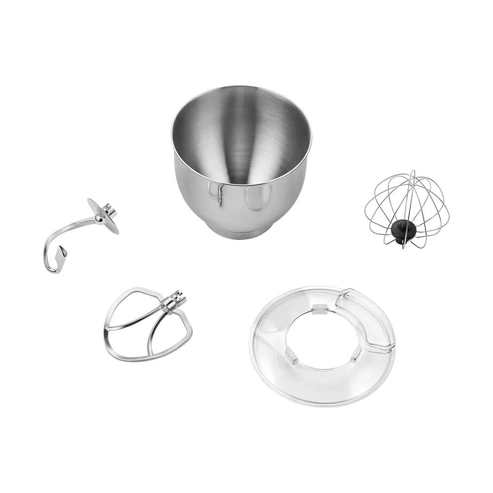 В комплекте идут венчик для взбивания, крюк для замеса крутого теста, насадка для смешивания и приготовления пюре. Форма насадок и чаши подобраны так, что почти при любом количестве продуктов насадка качественно их перемешает.