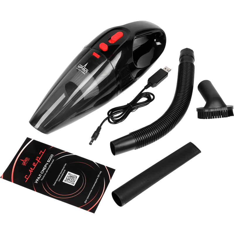 пылесос, гибкий удлиннитель, насадка с щеткой, щелевая насадка, кабель зарядки USB