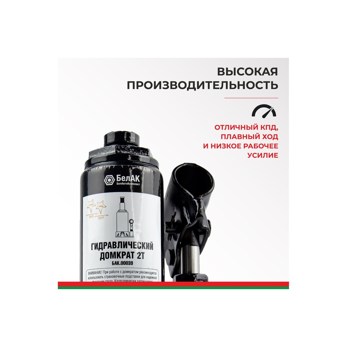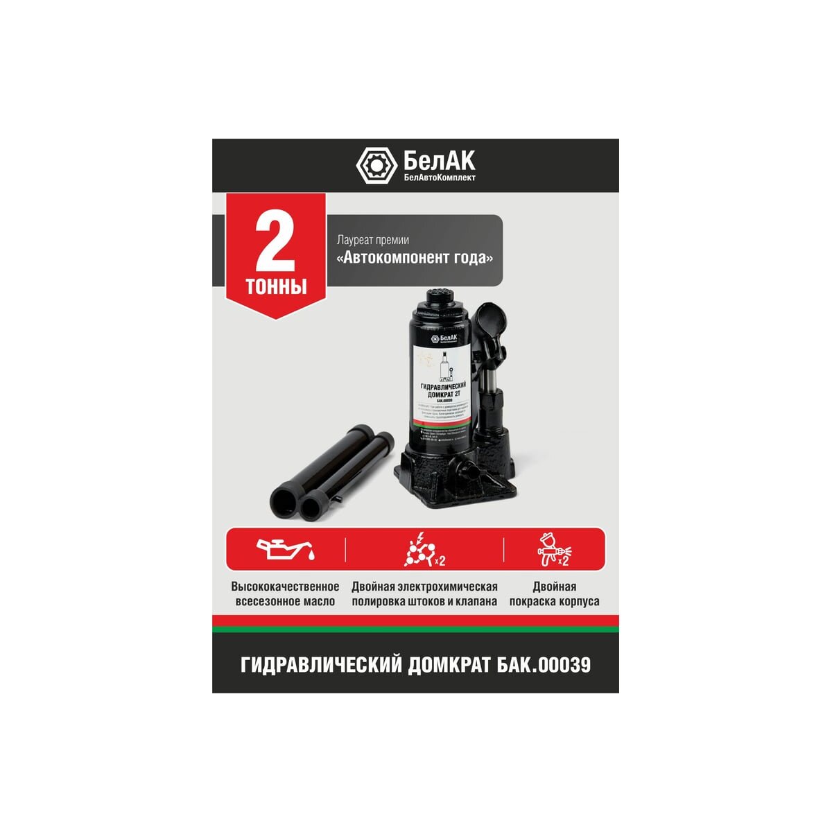 Домкрат БелАК 2 т БАК.00039 разработан российским производителем «БелАК», награждённым двумя национальными премиями «Автокомпонент года» и «Автоаксессуар года» за высокое качество и надежность выпускаемых домкратов. Продукция «БелАК» соответствуют нормам сертификации ISO9001 и ЕАС.