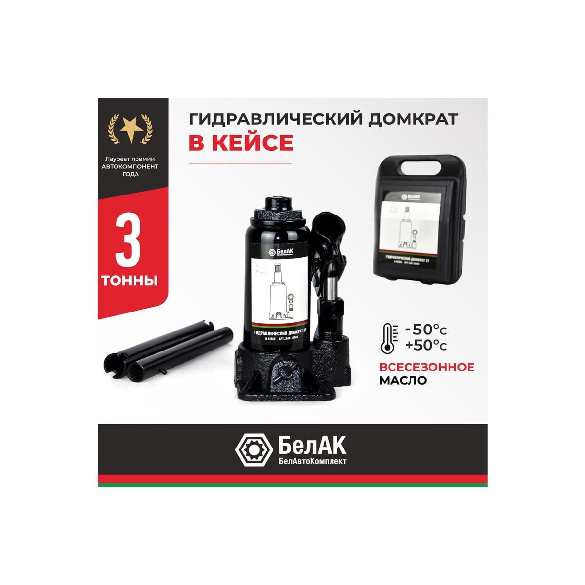 В комплект входит надежный морозостойкий и ударопрочный кейс, который обеспечит удобное и безопасное хранение инструмента. Эта модель домкрата "БелАК" идеально подойдет для ремонтно-монтажных работ с автомобилем, строительства и подъема небольших строений.